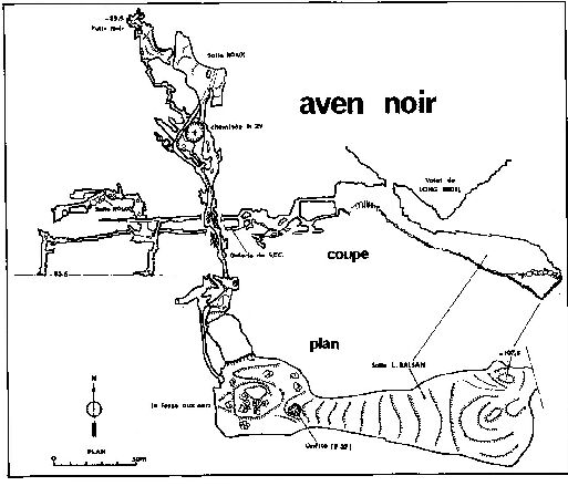 Sur ce tracé encore à découvrir, une cavité de légende, l'abîme le plus étrange des grands causses: l'aven Noir. Des pages lyriques du grand explorateur caussenard Louis Balsan. Des photographies fascinantes, le mince fil brillant d'une échelle pendant au milieu d'une immense salle, des stalagmites couvertes de mousse, un rayon de lumière oblique issu d'une lucarne du plafond et baignant l'éboulis d'une clarté glauque...