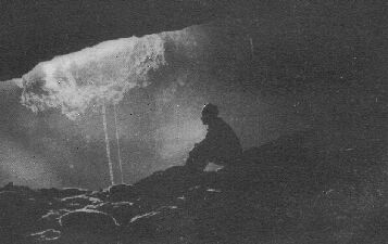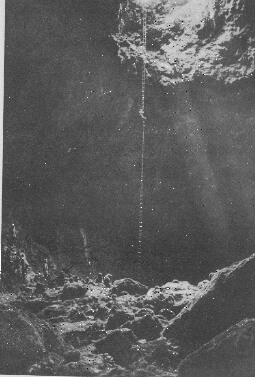 La descente dans cette "fosse aux ours", à distance de toute paroi, dans un jeu d'ombres fantastiques et d'échos interminables, laisse une profonde et étrange impression. Assis sur les terrasses moussues d'un vaste édifice stalagmitique au milieu de la salle nous regardons descendre les autres explorateurs. Le rayon de lumière oblique qui traverse la salle est bien là. Nous vivons un rêve éveillé. Mais déjà René, son éternel brûle-gueule aux lèvres, nous entraîne vers un balcon surmontant la fosse aux Ours. De là, le coup d'oeil sur le puits d'entrée est saisissant. Mais nous descendons un deuxième puits, parcourons des galeries... A vrai dire nous nous retrouvons là dans une caverne ordinaire. Salles, couloirs glaiseux, puits obscurs à enjamber avec prudence.