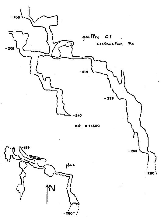 Aven C3 : arrêt en 1969 à -188 m , un méandre suivi d'un puits de 18 m amènent à un carrefour ( - 207 ). Réseau Fossile : méandres très étroits et petits puits conduisant à un colmatage (- 240 m ). Réseau Actif : il emprunte vers l'ESE une série de méandres et petites salles fossiles ; une diaclase SSO aboutit à - 215 au puits de la douche ( arrivée d'eau dans le plafond ). Palier humide à -229 m. Le puits devient vaste. A -259 m le ruisselet disparait dans une fissure impénétrable. Arrêt à - 280 devant un petit puits. Seule la recherche de la sécurité a arrêté l'avance dans cette cavité où souffle un fort courant d'air.