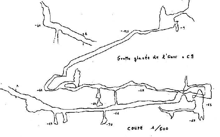 C9 ( Grotte glacée de l'Ours ). Au pied de la butte de Frontaza. Porche 1,50 x 3 m ht , méandre et puits de 7 m dans salle glacée de 10 x 4 m continuée par une galerie en forte pente SSO jusqu'à - 49 m. Laminoir glacé désobstrué ( forte aspiration ) ; une galerie fossile pratiquement horizontale , au sol sableux . Labyrinthe et puits ; un étage inférieur (point bas - 69) s'oriente ONO jusqu'à la base d'un puits de 40 m. Développement : 400 m.