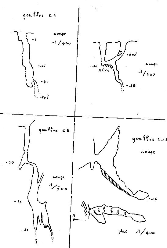 C5: 300 m environ à l'est du C3 : bouche 4 x 2 ; relais à -3; puits de 20m, névé ; lucarne avec puits d'environ 30 m non descendu ; bruit d'eau ??