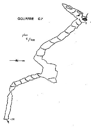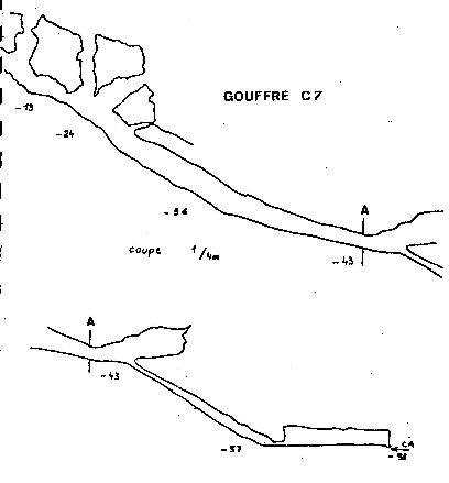 (cliquez ici pour plan et coupe du C7 ou aven du Névé éclairé.)