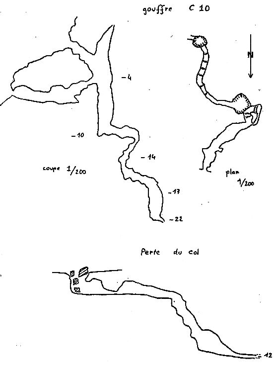 C10 : 50 m à l'ESE du C9. 2 entrées se rencontrent dans un puits à - 10 m. Un méandre se poursuit jusqu'à - 22 m