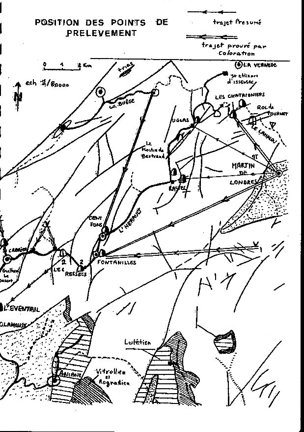 Sur la carte hydrogéologique au 1/80000 éditée par le BRGM, H Paloc a établi un trajet supposé entre les pertes de l'Hérault :