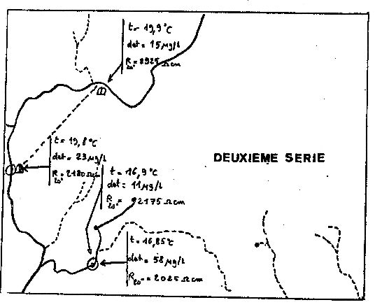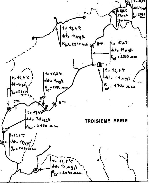 Dans cette émergence nous avons trouvé une concentration en détergents de 34 µg/L . Le plateau situé sur le trajet supposé et le bassin d'alimentation théorique de cette résurgence ne comprenant aucune habitation ni source de pollution , il semble donc que l'hypothèse formulée plus haut ait ici un argument en sa faveur.