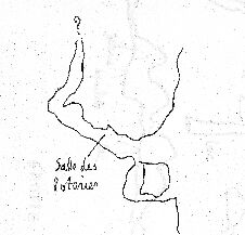Entrée Est : 45 m de galeries conduisant à la salle des Draperies. Deux salles étroites font suite, prolongées par un boyau qui débouche dans les deux salles du Potier avec un puits de 15 m , ressaut et grande salle ( 20 de l x 10 ht). Au SO une galerie de 20 m débouche sur la terrasse extérieure : l'entrée.
