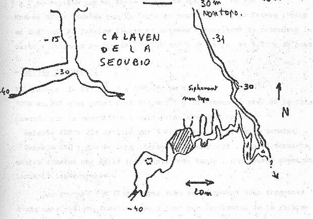 Galerie SSO : 26m de long légèrement remontante , les 15 derniers mètres forment une salle importante très haute , nombreuses cheminées; laminoir impénétrable.