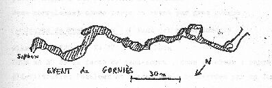 Trop-plein de la source cascade de Gorniès, 20m au NNE et 5m au dessus. Porche dans un bouquet de végétation. Au bout de 15m au Nord : galerie inondée ( -2 ). Un boyau latéral permet d'éviter une laisse souvent siphonnante. Ensuite une diaclase avec 2 m d'eau aboutissant à une petite salle (vases néolithiques). Un courant d'air à 22° sort d'une fente. La galerie prend une direction NE-SO. Le pendage qui était de 10°E devient de 10°S. La galerie s'oriente au N puis a l'E et siphonne en direction N à 140 m de l'entrée.