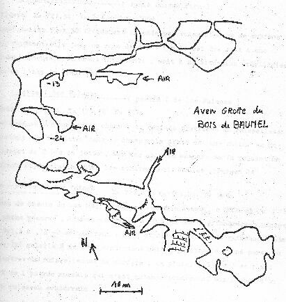 - au N1/4NO: un laminoir conduit à une petite salle. Au N un passage vertical scabreux (effondrement d'un plancher de cailloutis) conduit à une galerie spacieuse (4m de large et 2 de Ht) orientée N1/4NO. Belles concretions. Du côté N une diaclase remontante soufflante rapidement impénétrable. Du côté S 2 petits puits latéraux : l'un se continue par un boyau et une petite salle avec trémie soufflante. Au bout de 25m la galerie principale aboutit à un puits diaclase de 7m et relais . Coté ESE un trou souffleur dynamité donne dans une petite salle inférieure (4x3) avec trou souffleur. Côté NNO puits de 4m. Fond d'argile (1,55 m d'eau en hiver).