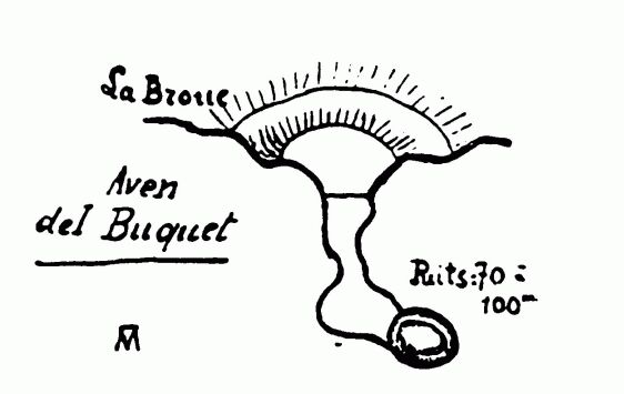 Les avens de Navas. Celui du Buquet ou de la Broue présente un couloir d'environ 50 mètres de long, terminé par un puits qui doit avoir bien près de 100 mètres de profondeur: il communique probablement avec un des évents de Bez. Celui de la Rabassière offre deux ouvertures jumelles le long d'une importante diaclase N. S. (20 à 30 m. de profondeur). Celui des Fades n'est qu'un entonnoir peu profond;