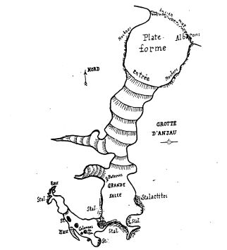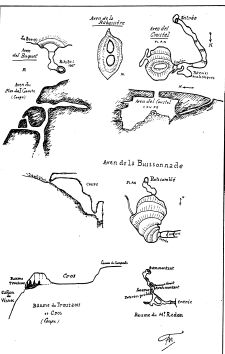 Au CENTRE: l'aven du Mas del Comte qui comprend au moins trois étages de grottes (les deux étages supérieurs sont accessibles et nous y avons recueilli des restes de sépultures préhistoriques: l'étage inférieur paraît peu profond, niais nous n'avons pu y descendre à cause des odeurs de bêtes mortes qu'on v avait jetées depuis peu); L'aven de l'Usclade (12 m. à pic), où nous avons assisté à l'extraction du cadavre d'un malheureux enfant nouveau-né; Les deux avens dits les Soutasses (grands sottschs),au milieu du champ des Biques, non loin de la route de Blandas à Montdardier (l'un d'eux extrêmement profond). L'aven de la Buissonnade, profond de 30 à 40 mètres à l'extrémité duquel on distingue un puits vertical obstrué par les éboulements (V. le plan); Les avens de Campaillou et de Flouirac (dans la dolomie tout excavée, nous avons observé là un grand nombre de fentes plus ou moins obstruées; profondeur des avens, de 1 0 à 50 m. et plus); L'aven de Montdardier (orifice obstrué); L'aven de Caucanas (15 à 20 m.), situé dans le lit d'un ruisseau et paraissant fort intéressant, mais dans lequel nous n'avons pu descendre à cause des odeurs méphitiques qui s'en dégageaient; Enfin, nous citerons plusieurs avens-grottes des pentes de la Tude et en premier lieu la célèbre grotte à stalactites du Pic d'Anjau qui se présente également avec tous les caractères d'un aven. La grotte d'Anjau offre d'abord une plate-forme extérieure à laquelle fait suite un talus fort incliné descendant jusqu'à 50 mètres de profondeur. Dans le fond, on observe Une salle et divers petits couloirs admirablement décorés de concrétions calcaires : on v voit des colonnes de 15 mètres de hauteur. Les traces de l'homme préhistorique sont nombreuses dans cette salle, c'est là que les bergers venaient autrefois chercher la pierre del tro (pierre du tonnerre, hache néolithique) qui préserve, disent-ils, leurs bêtes de la maladie du foie. Développement total : 60 mètres (V. le plan). Les albarons siliceux forment d'importants dépôts dans tous les environs et aux abords de la grotte, démontrant ainsi que le creusement de cette dernière remonte à une époque fort reculée ayant précédé le creusement de la Vallée.