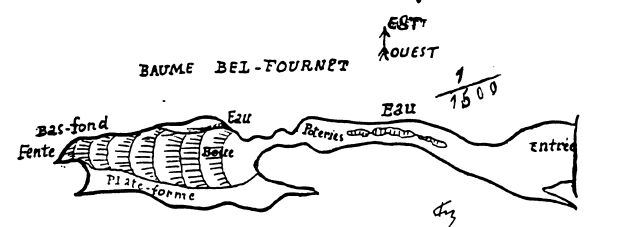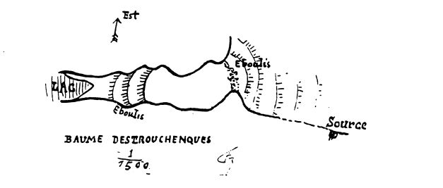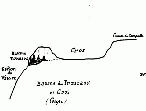 Mais ce n'est pas tout. Si nous descendons à 150 mètres dans la vallée, nous trouvons une nouvelle grotte qui se rapporte au même ensemble. Sa forme spéciale lui a valu le nom de Bel Fournet. Longue de 150 mètres environ et assez large dans sa seconde salle (V. le plan), elle descend en pente très inclinée vers l'intérieur du causse. En temps ordinaire, les eaux s'y infiltrent à travers les cailloux. Mais, à l'époque des inondations exceptionnelles. la masse des eaux souterraines remonte des entrailles du sol et se précipite avec fracas de l'ouverture. C'est donc un trop-plein des galeries souterraines qui ne fonctionne que lorsque les sources inférieures ne suffisent plus à cette tâche. Descendons encore un étage de 40 mètres et la Baume des Trouchenques nous fournira un nouvel exemple d'exutoire qui fonctionne beaucoup plus souvent. A l'intérieur, le niveau s'abaisse jusqu'à une sorte de petit lac, dont, il est impossible de reconnaître l'étendue. Une source permanente et impénétrable, située un peu au-dessous de l'entrée, est certainement alimentée par les eaux de ce lac.