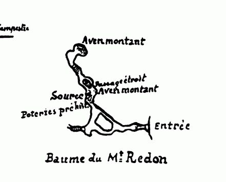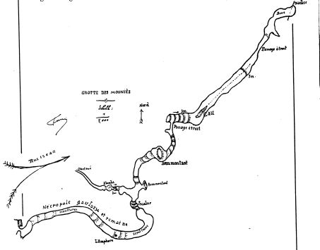 de la voûte et entièrement recouverte de concrétions encore aujourd'hui, les bergers viennent puiser de l'eau dans cette vasque d'un nouveau genre qu'ils appellent le bénitier. Au fond de ce tunnel long de plus de 150 mètres, un escalier artificiel mène dans une seconde partie de la grotte formée de deux branches : l'une dérivant d'un aven ouvert sur les bords du ruisseau des Mourgues, l'autre se prolongeant en aval et formant un petit ruisseau souterrain avec flaques d'eau (V. le plan). La direction et la pente générale sont celles du ravin extérieur (SO-NE).
