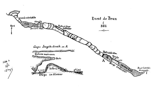 - On entre dans l'évent de Brun par une ouverture très pittoresque. On y trouve d'abord un petit lac souterrain puis une grande et belle galerie ornée de remarquables concrétions et haute de 10 à 15 mètres. A une distance de 70 mètres environ, un puits profond de 7 mètres s'ouvre sur la paroi de gauche. D'autres ouvertures se remarquent à travers les interstices des blocs qui indiquent la présence d'un second étage occupé par l'eau à un niveau inférieur. Brusquement le sol se dérobe sous les pieds, et ce n'est que par un puits de 15 à 20 mètres de profondeur totale qu'on peut avoir accès dans le second étage. La descente se fait au moyen d'une échelle en corde sur un mamelon formé par des éboulis. Au bas de ce talus, un lac mystérieux aux rives de sable fin s'étend devant nous et le magnésium ne parvient pas à nous en faire voir la fin. La largeur du couloir est ici de plus de dix mètres et sa hauteur très considérable. Nous percevons fort nettement dans le fond un bruit de cascade. Malheureusement, pour aller jusque-là, le bateau démontable serait de toute nécessité. Derrière nous, et contre la paroi, un tout petit ruisselet court rejoindre d'autres bassins d'eau au sortir desquels il ira former une source sur les bords de l'Arre.