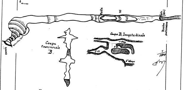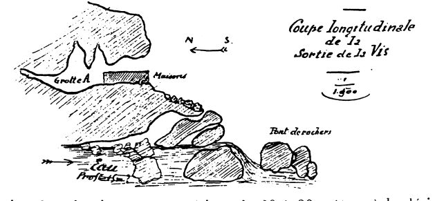 Cette même fissure est très visible au sein de la grotte qui domine la source de quelque 25 mètres. A l'époque quaternaire. elle avait déjà déterminé la formation d'une dérivation souterraine dont le niveau est supérieur de 20 à 30 mètres à la dérivation actuelle (V. les plans).