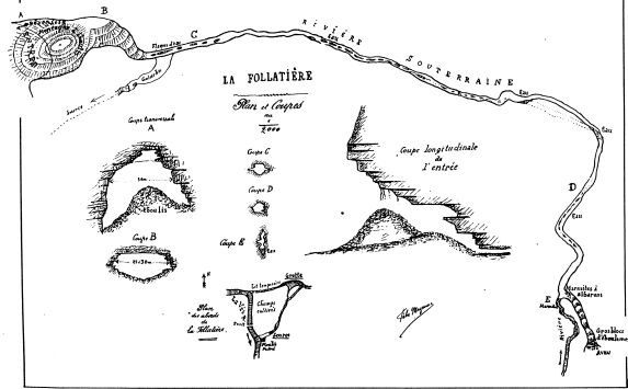 La source Follatière doit servir d'exutoire à toutes les eaux englouties par les avens de la Jurade, de la Borie d'Arre et du château d'Assas. Le fermier du Pont m'assure l'avoir vu jaillir avec force certains jours où l'orage avait épargné la vallée et n'avait sévi avec violence qu'aux environs de ce dernier château.
