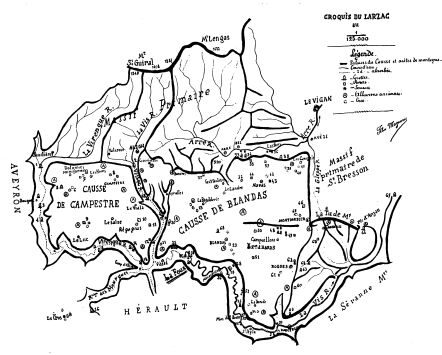 Pour celui qui veut embrasser d'un seul coup d'œil toute l'étendue de l'immense causse du Larzac, je ne connais pas de meilleur poste d'observation que le sommet du Saint-Guiral, à 1349 mètres d'altitude. A l'extrémité d'un rameau détaché du massif de l'Espérou, cette montagne forme comme une sentinelle avancée d'où la vue s'étend sans obstacle, à l'Ouest et au sud, sur toutes ces mornes tables calcaires. Ce belvédère est si majestueux qu'il fut de tout temps un centre d'attraction pour toutes les populations environnantes. Il y a peu d'années encore, des milliers et des milliers de personnes se rendaient là tous les ans pour assister à d'étranges cérémonies dont le caractère rituel doit être une survivance d'antiques coutumes païennes. Vus ainsi de très haut, nos pauvres causses paraissent presque uniformes. En réalité, ils portent les traces de nombreux ravinements qui témoignent d'une phase très active d'érosion superficielle. L'altitude générale varie de 650 à 900 mètres. Ce qui frappe surtout, aujourd'hui, c'est l'absence de toute végétation. S'il est vrai comme le prétend un dicton populaire qu'on pouvait autrefois traverser le causse d'un arbre à l'autre sans toucher terre, il faut reconnaître que tout a bien changé depuis ces heureux temps : le petit bois de Salbous, sur les pentes de la Virenque, serait le seul témoin de cette luxuriante végétation. Ce n'est point que la terre végétale fasse défaut : nombreuses sont partout les couches d'alluvions anciennes. Mais l'homme s'est livré ici à une oeuvre insensée. Le déboisement à outrance a causé la mort du pays. Sur le plateau de Campestre, notamment, c'est aujourd'hui la soif dans toute son horreur. En plein mois d'août, lorsque toutes les citernes sont épuisées, la vie devient littéralement impossible et rien ne justifie mieux le cri d'alarme poussé par notre ami Martel dans son étude sur la " marche à la lune ". Le Larzac constitue comme une sorte de détroit jurassique, à travers les Cévennes primitives, reliant le bassin méditerranéen à la grande mer des Causses. Vers le centre, la Vis est parvenue à creuser une étroite fissure de 3 à 400 mètres de profondeur! Ses deux branches-mères délimitent fort nettement les tables calcaires de Campestre et de Blandas, objet principal de cette étude. Des pentes granitiques et schisteuses du Saint-Guiral se précipitent vers le sud une infinité de petits ruisseaux dont la réunion constitue les deux rivières d'Alzon et de Sauclières, qui coulent pendant quelque temps au milieu de verdoyantes prairies. Mais leur vie n'est qu'éphémère- à peine au contact des assises calcaires, les voilà qui disparaissent brusquement en des abîmes inconnus. Et c'est alors l'abomination de la désolation! Pendant des kilomètres et des kilomètres, la gorge immense se poursuit étroite et profonde, mais dans un silence de mort. Un peu en amont de Vissec, les deux canyons du Vissec et de la Virenque confondent leurs cailloux et, bientôt après, des bouleversements dans le lit de la rivière font pressentir une importante modification dans le cours de celle-ci. Tout à coup, des entrailles du sol, une masse d'eau prodigieuse s'élève en bouillonnant et se répand en cascades écumeuses avec un bruit formidable. C'est la Foux, une des sources ou résurgences les plus pittoresques de nos causses cévenols. Désormais la vie renaît au fond de l'étroit canyon et nous verrons la rivière aux flots verdâtres dérouler ses interminables lacets entre deux énormes murailles calcaires. A la base, règnent les dolomies brunâtres, épaisses souvent de près de 100 mètres. En haut flambent au soleil les falaises colorées du jurassique supérieur. Entre les deux, un vertigineux talus à stratification régulière, forme comme les marches d'un escalier gigantesque. Naguère encore le colossal cratère de Navacelle était la plus étonnante merveille de notre région; depuis l'installation d'une prise d'eau, elle a quelque peu perdu de son originalité. A partir de ce point jusqu'à Madières, le canyon était à peu près ignoré avant notre exploration. Les parois en sont tellement rapprochées et tellement escarpées qu'on ne peut l'aborder qu'en un seul point, au Mas del Pont, par un escalier de 1000 marches ! Et cependant que de féeries accumulées par la nature ! Partout des assises prodigieuses, des abris, des grottes, des sources jaillissantes et des coulées de tuf. Mais la merveille, non décrite encore, est la puissante Follatière, rivière souterraine dont le porche n'a pas moins de 50 mètres de hauteur. Aux jours d'orage, tout un fleuve impétueux s'échappe par son ouverture des profondeurs mystérieuses du Causse de Blandas. Presque en face, les eaux de Saint-Maurice sont ramenées au jour par les deux évents du Gournioou et du Gournieyras. A Madières, une importante faille transversale livre passage à l'ancienne voie romaine du Vigan à Lodève. Le pauvre hameau ne peut tenir au fond de la crevasse et ses maisons chevauchent les unes sur les autres. A droite et à gauche on distingue des ruines de châteaux sur des pointes de rochers ! Quelques pans de murs sur une aiguille sont tout ce qui reste d'un ancien repaire de brigands, détrousseurs de grands chemins. Voici ce que nous apprend une vieille chronique de Montpellier, fort éloquente dans son laconisme : " Et en aquel an (MCCXVII) prezeron, li homes de Montpellier, Madieyras que son en Larzac, et deroqueron lo castel, et cremeron los vals, car lo senhor del castel raubava los camins " (1). Madières est à l'extrémité du Larzac. Une belle route s'étend de là jusqu'à Ganges, au confluent de là Vis et de l'Hérault. La gorge, quoique encore, aussi profonde et resserrée, perd un peu de son caractère sauvage. Entre la Séranne et le pic d'Anjau, les vallées latérales y sont plus nombreuses : nous sommes déjà dans la région des Cévennes proprement dites.