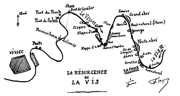 les parois sont extrêmement rapprochées et fournissent de curieux étages de grottes témoignant de la puissance érosive du cours d'eau aux époques quaternaires. Certains abris n'ont pas moins de 100 mètres d'ouverture! Les chaos y prennent des proportions gigantesques. Un phénomène curieux est celui d'un bloc immense détaché de la montagne et auquel l'étroitesse du canyon n'a pas permis de descendre jusqu'au fond : il est resté suspendu, pincé entre les deux parois, formant une sorte de gigantesque pont naturel. On parle avec enthousiasme du fameux Chaos du Pas de Souci dans les Gorges du Tarn, mais ce spectacle est loin d'égaler celui que l'on éprouve en remontant le canyon de la Vis jusqu'à 2 kilomètres en amont de sa source. A un coude brusque du canyon, la rivière souterraine jaillit enfin tout entière des profondeurs de la dolomie. Nous avons pu nous frayer un passage au milieu des énormes blocs encombrant la sortie et formant une barrière qui oblige l'eau à remonter en arrière pour se répandre ensuite en cascades écumeuses. C'est là un obstacle que la violence des eaux finira par faire disparaître. En remontant la source de quelques dizaines de mètres, nous avons pu constater que, contrairement à ce qu'on croyait, sa direction générale est celle d'une grande diaclase Nord-Sud qui suit la gorge en amont de la Foux.