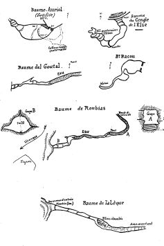 Il ne faut voir dans les grottes des hauts niveaux que les témoins des anciennes dérivations souterraines : ce sont des fragments de couloirs presque toujours en relation avec les cheminées ou avens du Causse. Quelques-unes portent des traces du passage de la Vis au début du quaternaire ou à la fin des temps pliocènes. Nous citerons, dans la Virenque: celles de Grailhe, de Baoumo Ferrenco, du Garot, de la Paillère, etc.; dans le Vissec. celles de Trouiaou (v. ci-dessus), du Ferlet, des Fades, etc., toutes de très faible étendue. Dans le lit de la Vis, la Baume-Auriol est curieuse par les nombreux aménagements dont elle a été pourvue; celle du Roc du Midi sera décrite plus loin avec quelques détails; les abris de la Burle, les baumes du Cengle de l'Elze, de la Lègue, etc., sont en relation étroite avec des cheminées ouvrant sur le plateau; dans toutes nous avons retrouvé soit des ossements quaternaires, soit des traces d'habitat néolithique.