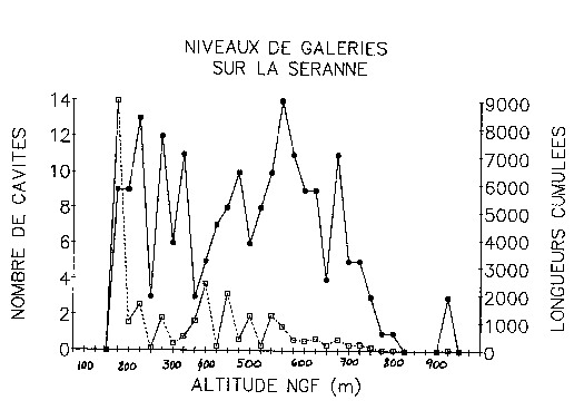La figure 1 montre que les galeries de grottes et avens de la Séranne forment une série de niveaux, répartis de façon discontinue en fonction de l'altitude.