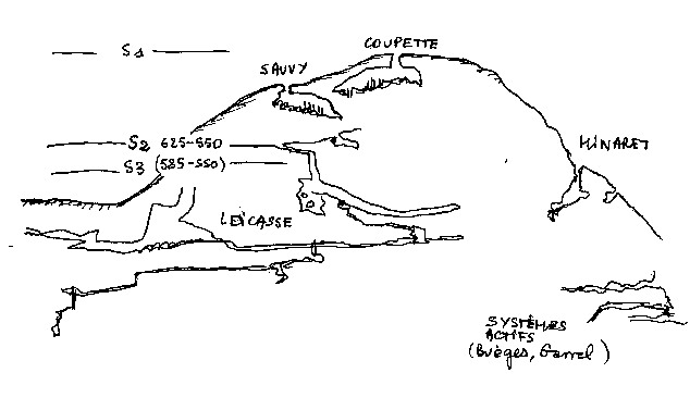 a - le niveau 700 est représenté: son plus beau fleuron est l'aven de la Coupette, assez grandiose (salle 97x20x22). Ce niveau correspond à la surface S1 du Puech de Larret dont le plancher est à 700m, les sommets des tas de foins étant à 780. Un niveau annexe à 650 (aven N°1 de la Sauvy, grotte de Cisteragnes) semble pouvoir lui être assimilé. Nous avons discuté plus haut de ce niveau des 700m et de la surface S1.