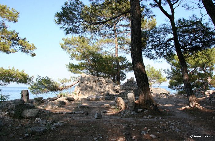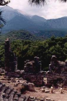 lo bòsc perfumat de grands pins, ont s'escond lo temple d'Atenà, solitari, amb