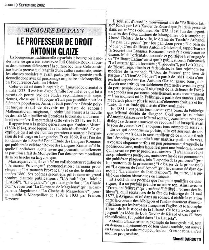 En 2002 Glaudi Barsòtti publiquèt una pichona notícia pro assabentada dins lo quotidian "l'Hérault du jour " dau 19 de setembre. Aqueste article nos siaguèt comunicat per los amics dau Bram dau Clapàs. L'avètz aquí en pdf (600 ko) o en jpg (190 ko).