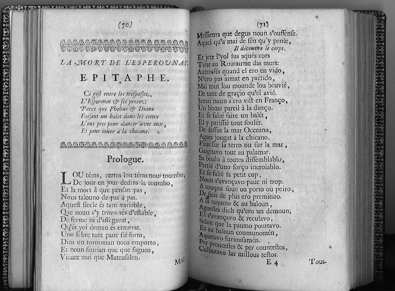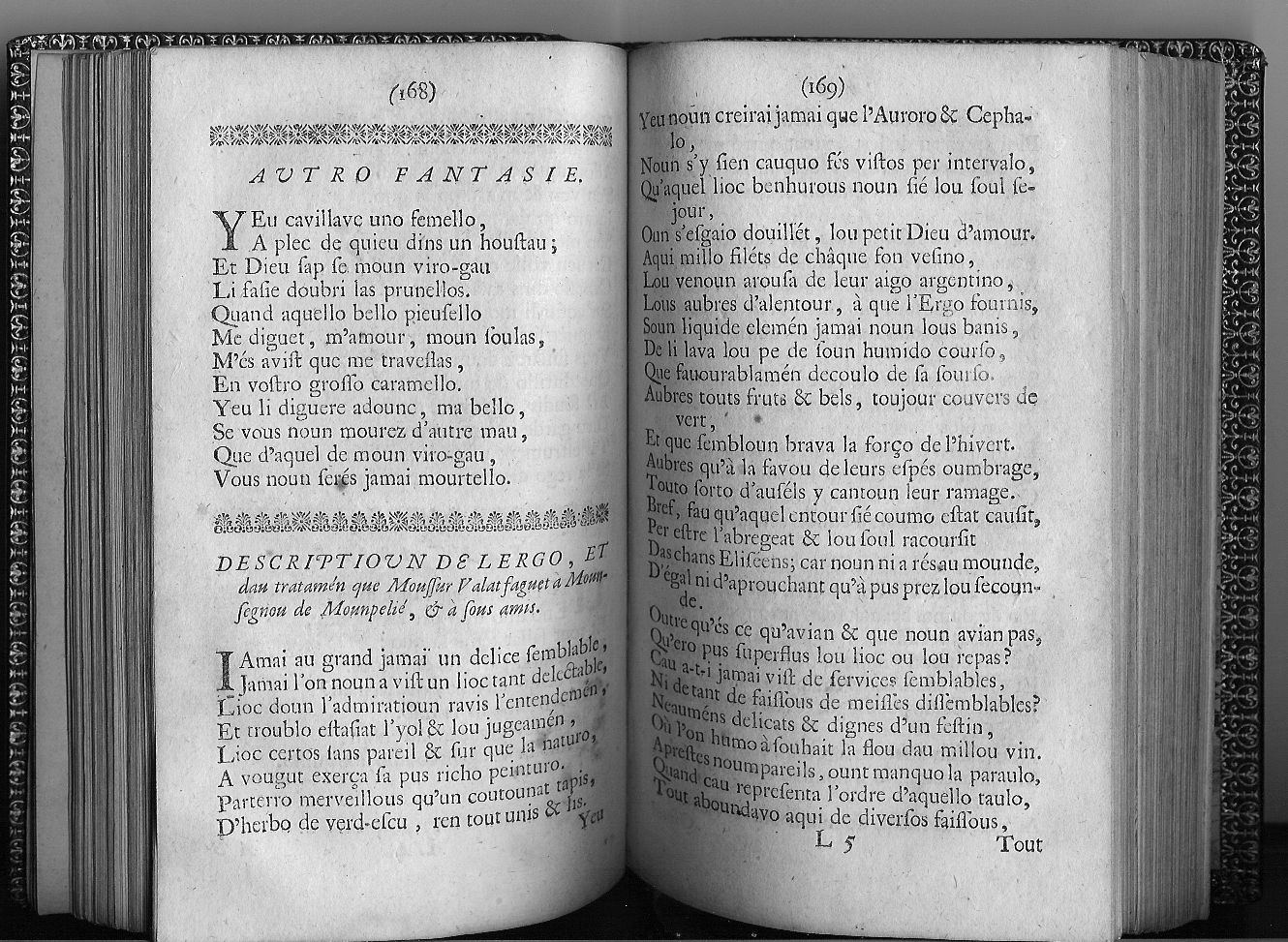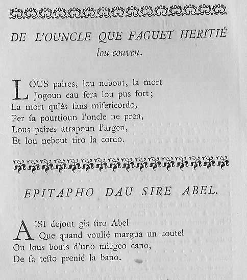 Envisatjam de metre aquí en linha l'ensèms dels tèxtes (de mau trobar) d'aquela òbra importanta de las letras d'òc. Aquí ne'n la lista (Basada sus l'edicion de 1874 dicha d'Aubert des Ménils). Per lo moment trobaretz quauques pèças classicas representativas (clicatz sus lo ligam): atencion, las pus gorrinas son sus la fin de la lista! O completarem plan plan.