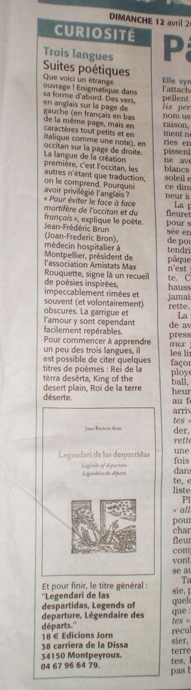 Doas mençons dins la premsa locala: Midi Libre dau 12-4-09 (a gaucha) e "la Gazette" N°1083 19-25 març 09 p67.