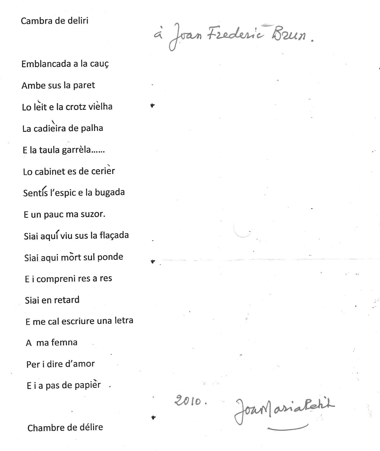 Petit un poèma inedich que me dedicava en 2010. Me sembla qu'a pas jamai