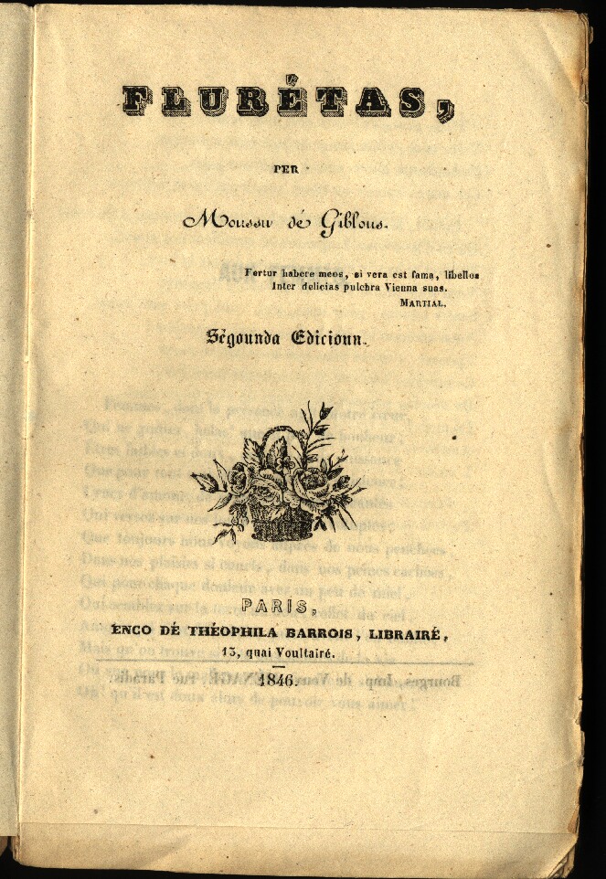 O lenga de ma mèra e de mos bons amics as servit a parar mas pus doças pensadas a daurar lo malur das terriblas annadas a calmar ben sovent mos regrèts e mos laguis. Dels Dieus tus deveniás una lenga adorada lorsque t'embelissiám jot lur caud eternèl lo sorire divin, la boca benaimada d'aquela qu'aiçaval fasiá raivar lo cièl L'arlequin franchimand a gastat ta musica defigurat tot traits, enlordit ta beutat per la luna dau Nòrd, a l'ardor letargica ton bèu sorelh d'amor s'es per tròp rafrescat. Au jorn d'uòi siás pas mai fresca, escarrabilhada ma pastora! As perdut tas divinas colors los Gòts, los Ostrogòts antau t'an atifada volguèron t'immolar coma lo Frank gelós!