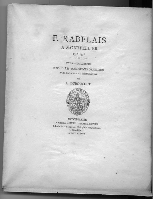 "F Rabelais a Montpellier" per A Dubouchet, es un obratge rar recercat per los bibliofils, tirat a 272 exemplars en 1887. Dins la famosa colleccion dels "Cent-Quinze" qu'aviá tanben reeditat Despuech-Sage. Reforfa de documents sus los dos sojorns de Rabelais a Montpelhièr. Ne tire un interessant document que mòstra Rabelais, dau temps de son prumièr sojorn, participant a una "Congregacion" au mitan dels mèstres de l'universitat d'alavetz, dins l'ostau de Griffy.