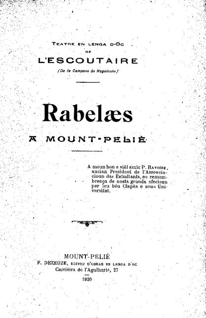 Rabelais a Montpelhièr... 1530-1538. Pas que dos sojorns brèus dau grand umanista torangèl e pasmens lo remembre ne demòra mai de 450 ans puòi.
