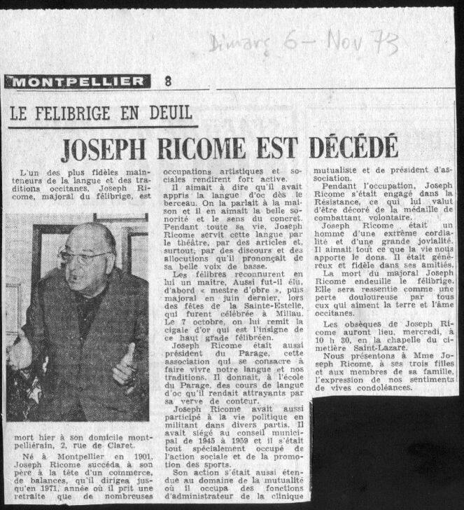 cliquejar aquí per veire sa notícia necrologica dins lo Midi Libre dau 6 de Novembre de 1973.