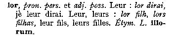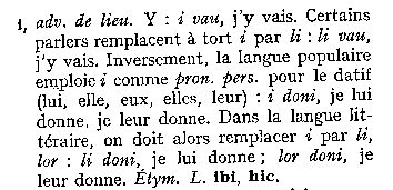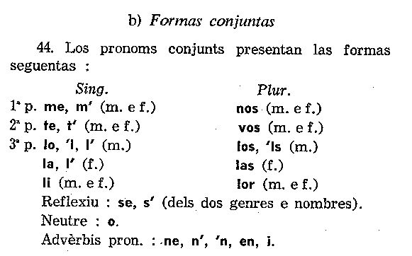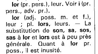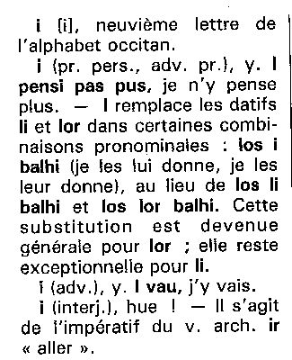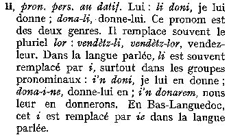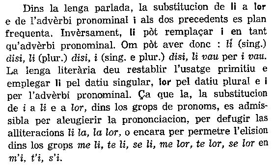 A Montpelhièr li e lor an disparegut au sègle XVII. Son, coma en provençau, remplaçats per ié que los escrivans escrivon tot còp i. Il leur dit se dirà pas lor ditz mas "ié ditz"... que sembla mai corrècte d'escriure "i ditz". Ils ont apporté leur nourriture se dira "an portat son manjar" et non "lor manjar"... Aquí los normalizaires, quand an pogut nos faire passar dins sas estaminas, son estats sens pietat. Nos an emplastrats de li e de lor fins a ne desnaturar cap e tot totes los tèxtes. Verai qu'Alibèrt vòu far tornar pertot "lor"(datiu plurau cf Grammatica p 64)... e que se pòt pas negar que Sage e Roudil metián "li" e "lur" (que m'an un pichon èr de gallicisme, me tiraretz pas aquò de l'idèa)... Aquò s'es finit amb una mièja mesura que significa pas res, e qu'es de metre pertot "li" a la plaça de ié... De qué nos ensenhava Rogièr Barta sus aquel afar dels "prenoms conjonchs"? Dins la Gramatica d'Alibèrt (p 63) se legís aiçò: |