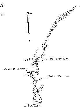 5.102. Aven N°1 des Limonières 706,26-169,64-240m. Bathonien dolomitique (faille NE visible dans les deux derniers puits). A 550m E des Limonières 500m N de la Grange. A gauche d'une piste pour troupeaux venant de la Grange 200m aprés son intersection avec le coupe feu. GSG 1950 (J Valat) jusqu'à -13. GERSAM 1975: sur dynamitage -45 puis en 1980 sur pendule -95. Bouche 2x1,5. Puits de 8, 2,5 et 2. Vers le S une étroiture dynamitée ouvre un puits de 28m (8x5) bouché au fond par les éboulis (-43). Une lucarne à -25 et la traversée d'un petit puits parallèle de 5m permet de déboucher dans un puits 6x4 de 40m (Puits Saint Arroman). Au fond (-65) galerie descendante de 50m bouchée par l'argile à -80 (trous souffleurs). A -55 soit 10m au dessus du fond du puits Saint Arroman un pendule donne dans une haute diaclase étroite qui se poursuit par un puits subvertical de 30m (3x4) au fond duquel une vaste galerie argileuse de 30m (4x10) se termine par un méandre trés étroit à -95. L= 115; D=272; P=-95m. Brun 1975a; GERSAM 1979b; GERSAM 1980 (plan); Chéry 1984