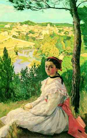 Puis elle partit pour l'Angleterre, où elle passa quelque temps dans un pensionnat, à Kenilworth. Elle en revint, sachant et parlant admirablement l'anglais, mais peu sympathique à cette nation qui la révoltait par ses égoïsmes et ses hypocrisies. Pourtant elle en rapportait deux admirations qui eurent une grande influence sur elle : Shelley et Robert Burns. - A cette époque, très artiste déjà, son choix n'était pas encore fait entre les arts qui semblaient la solliciter presque égailement; ainsi, excellente musicienne, mais, sans exclusivisme, éprise de l'école nouvelle et des vieilles chansons populaires, elle se sentait curieuse aussi de la peinture; et comme sa soeur cadette Jeanne était, elle, poussée très décidément vers cet art, leurs parents résolurent de leur donner un maître. Elles étudièrent toutes deux ensemble d'abord chez un peintre dont je ne me rappelle pas le nom, ensuite dans l'atelier de M. Dupuis, tué depuis si malheureusement en duel, et qui, s'étant compromis dans la Commune, rentrant alors d'un exil récent en Angleterre.