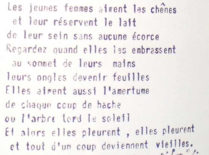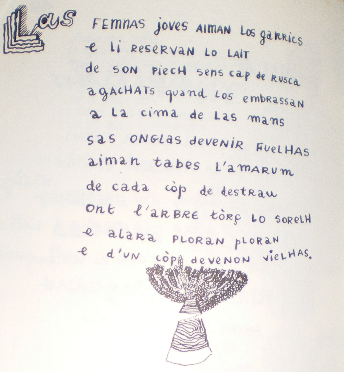 A l'aritmetica del temps opausava la geometria de sas ancas. Se riscava nusa dins la glòria del vèspre. Balava ambe las ròsas sens espinhas tota doçor confonduda. Demòra encara dins mos dets dolents la flaira de las flors e la del velors prim sus mos pòts endormits. |