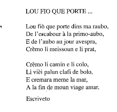LOU FIO QUE PORTE ... Lou fiò que porte dins ma raubo, Crèmo li camin e li colo, Escriveto