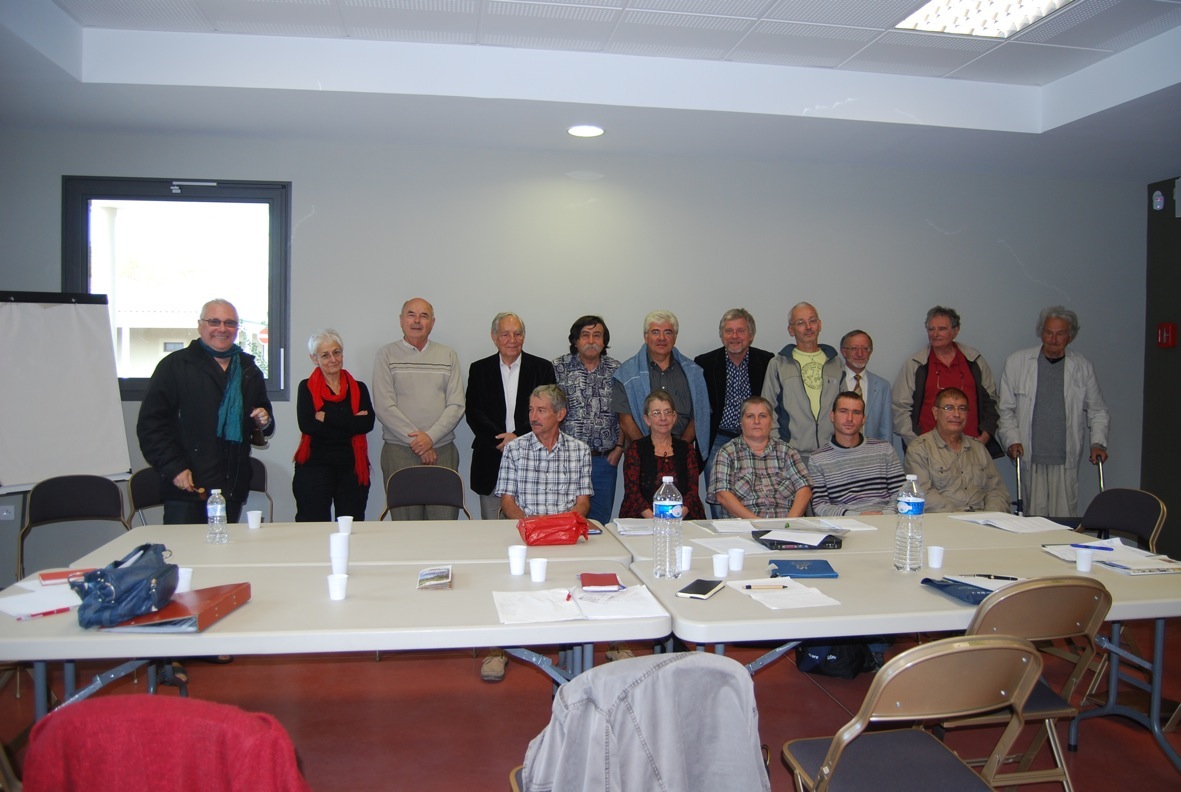 Fòto d'ensèms dels participaires. Dreches, de gaucha a drecha: Òffre, Bizòt-Dargent, Rixte, Jumèu, Matieu, Bronzat, Brun, Forêt, Courbet, Perotto-André, Fléchet; assetats: Landièr, Rixte MC, Cavalcanti, Anghilante, Pecout
