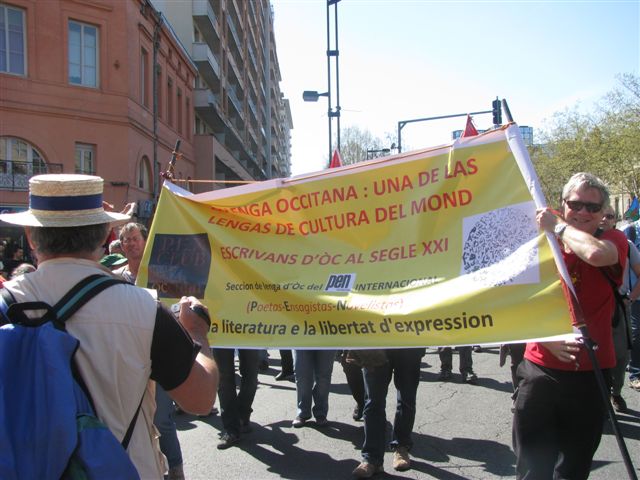 La velha èra lo grand passacarrièira dins las carrièiras de la ciutat mondina, per revindicar una lei de las lengas minoradas de França. Un flume gaujós e afestolit de colors de sang e d'aur, de croses occitanas, las musicas, las danças. I èrem au mitan, de segur pas los mai vesedors mas aiçò èra pas nòstra tòca, amb aquela bandièira flame nòva qu'anóncia : " La lenga occitana es una lenga del mond " e nos presenta coma : " Escrivans d'Òc al sègle XXI, seccion de lenga d'Òc del PEN Internacional (Poetas-Ensagistas-Novelistas) per la literatura e la libertat d'expression ". Aquel passacarrièiras èra de segur una escomessa après que se siaguèsse capitat de recampar 25000 personas per la lenga d'òc a Carcassona en 2009. Caliá faire au mens melhor. E de segur la tòca es estada gandida, que nos sèm comptats 30000 e que las fòrças de l'òrdre donan l'evaluacion de 20000, çò que permet d'afortir qu'èrem au mens 20000, e que l'epòca ont tot l'occitanisme podiá caupre dins un carri (amb un Manciet risolièr diguent a Max Roqueta : " se lo carri tomba dins la comba, i a pas pus d'Occitania ") e ben aquel temps es avalit e la revindicacion occitana a pas pus un caractèr confidencial. De mai, cau notar que lo viatge a Tolosa a un còst e que mai d'un occitanista afogat nos a fisat qu'i anava pas per de rasons de moneda. Una capelada a nòstre car Joan-Pau Creissac qu'a tengut lo margue e la bandièira pesugassa dau PEN occitan tot de long de la caminada, amb un larg sorire sus sa cara coma o mòstran las fòtos ! Urosament sèm estats lèu rejonchs per Magalí Bizòt, Teiriç Òffre, Miquèl Decòr, Claudi Alranc, Bruno Peiràs… qu'an portat d'ajuda, e nos son tanben venguts encoratjar Louise Esher, Xavièr Bach, Pèire Venzac, Joan-Claudi Forêt, Jaume Figueras, Jaume Landièr, Frederic Fijac… E nòstre car sòci ariegés de Saverdun, Andrieu Pagés, reialament enropat dins una bandièira sang e aur asornada de la crotz de Tolosa, acompanhèt la bandièira tot de long de la caminada, e distribuiguèt als qu'espiavan la bandièira lo papieiron en òc e en francés qu'explicava : " Escrivans d'òc del P.E.N. internacional : qual sèm ? " E se sèm totes retrobats sus la plaça dau Capitòli, tant de drapèus que se balancejavan, tant de gents comolas de gaug vestits de las caudas colors de nòstre país, de manidets escarrabilhats, de sorires, e lo micro que fasiá lo bilanç dau jorn : capitada, capitada. E la musica, poderosa. Mòstra clara de tot lo revoge de novelum que bolèga lo movement musical occitan d'aquesta passa…